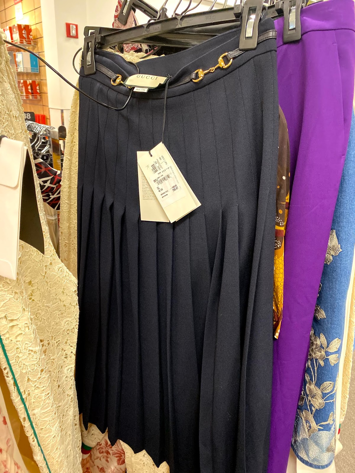 You’ll immediately notice a full rack of runway Gucci. Before you get too excited, most of the items look like they are from the Spring 2016 collection. That means, lots of rainbows and sequins, which are important Alessandro Michele fashion moments but seem a little dated not yet retro. A Gucci knit with a dog in a bow-tie is $900 from $2300 and a dress with a sequined collar and a striped pleated bottom is $2000 from $8585. You can click here to see pictures.