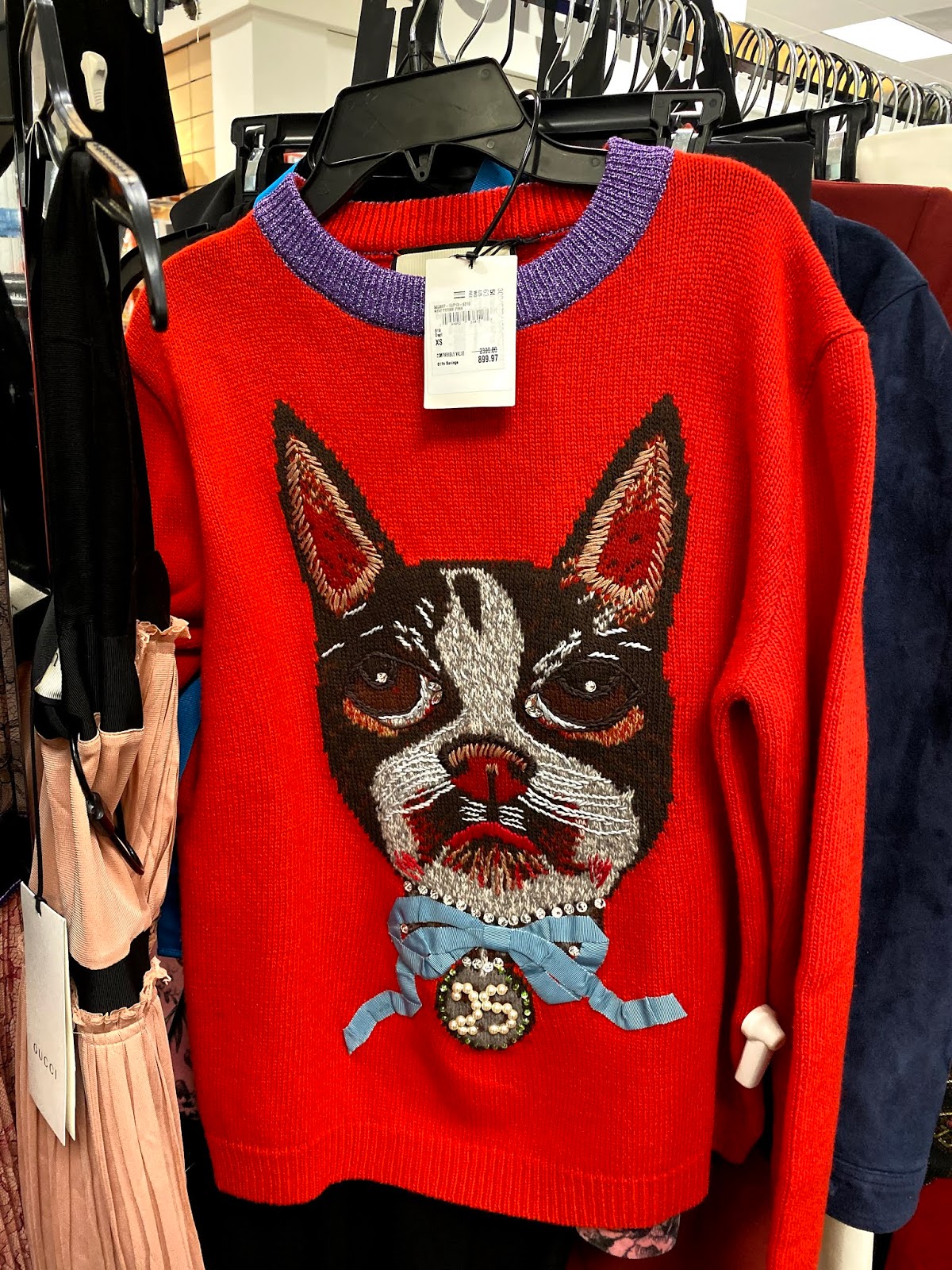 You’ll immediately notice a full rack of runway Gucci. Before you get too excited, most of the items look like they are from the Spring 2016 collection. That means, lots of rainbows and sequins, which are important Alessandro Michele fashion moments but seem a little dated not yet retro. A Gucci knit with a dog in a bow-tie is $900 from $2300 and a dress with a sequined collar and a striped pleated bottom is $2000 from $8585. You can click here to see pictures.