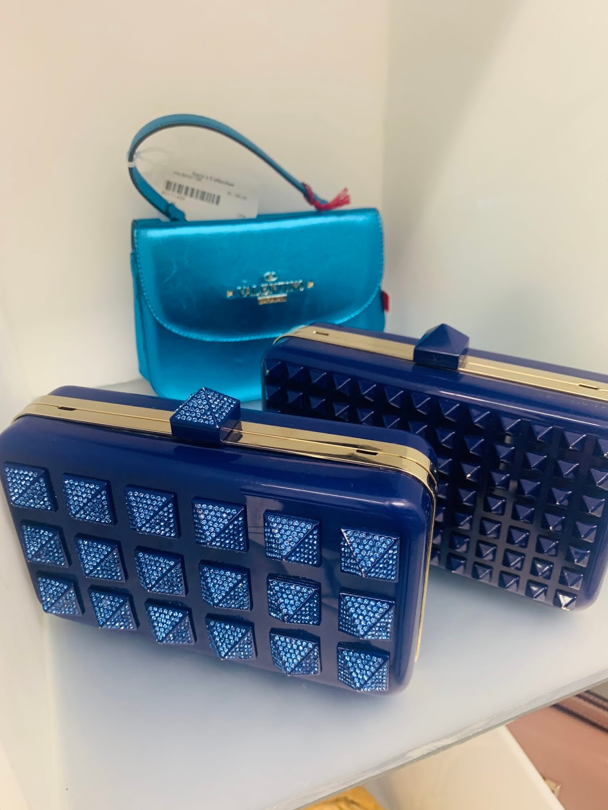 Over towards the checkout counter, you’ll see an assortment of jewelry and belts. Most are priced at about 80% off retail. These flower drop earrings in assorted colors are $65 from $350 and there are bins of great belts all priced at $40. Classic ODLR floral “Tro” bags are $537 from $1790. (We have pictures and prices over here.)