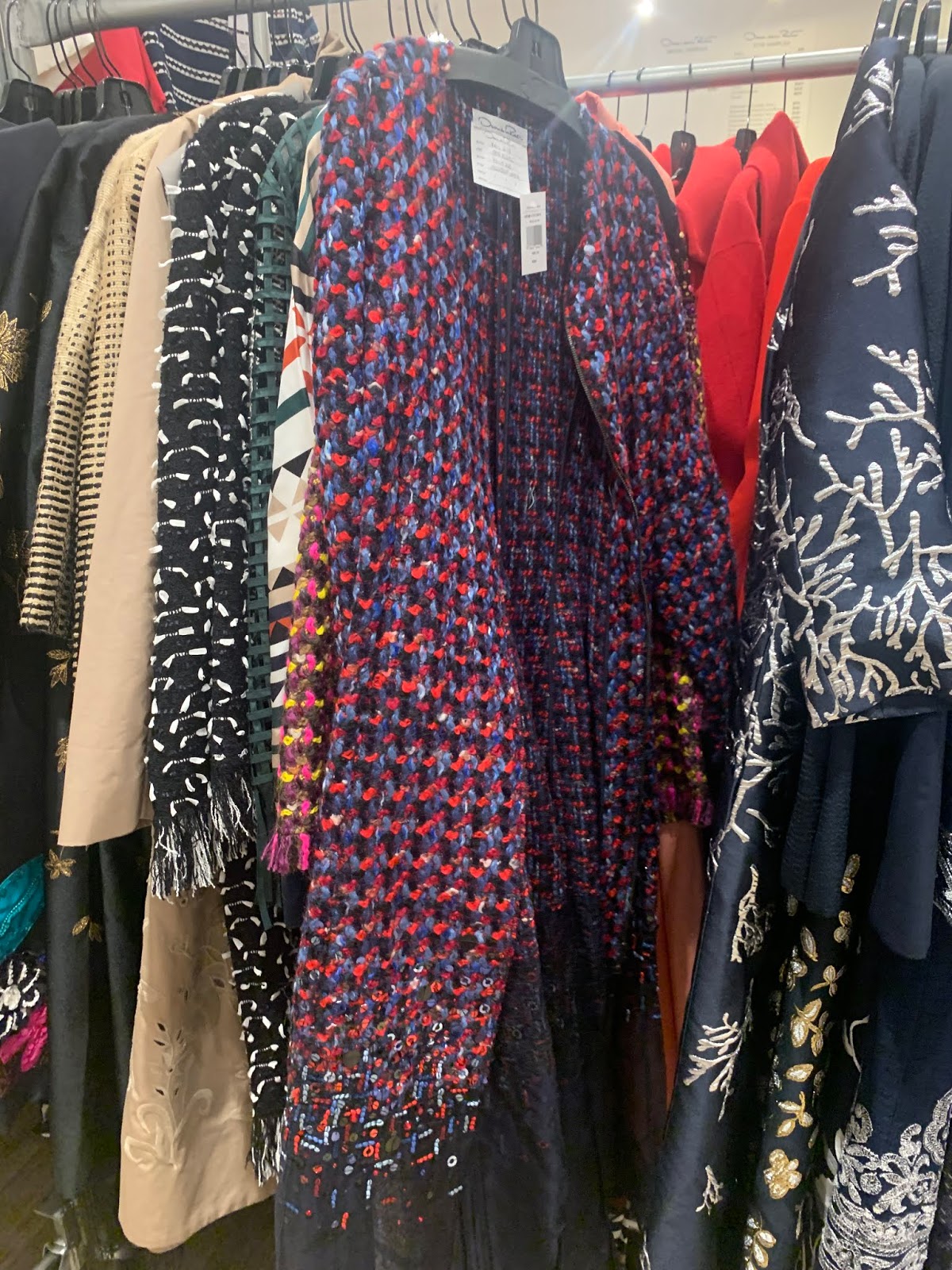 Over towards the checkout counter, you’ll see an assortment of jewelry and belts. Most are priced at about 80% off retail. These flower drop earrings in assorted colors are $65 from $350 and there are bins of great belts all priced at $40. Classic ODLR floral “Tro” bags are $537 from $1790. (We have pictures and prices over here.)