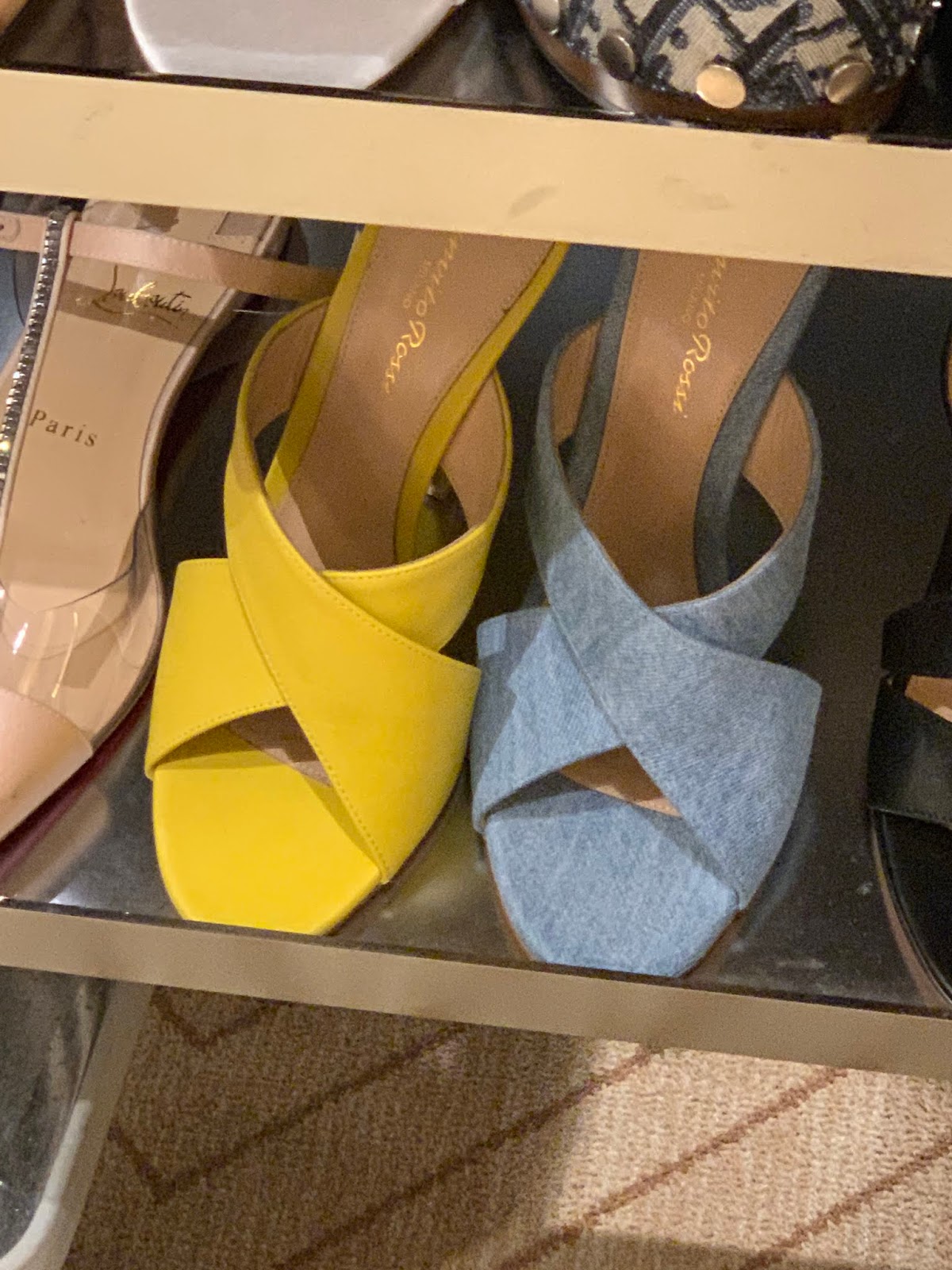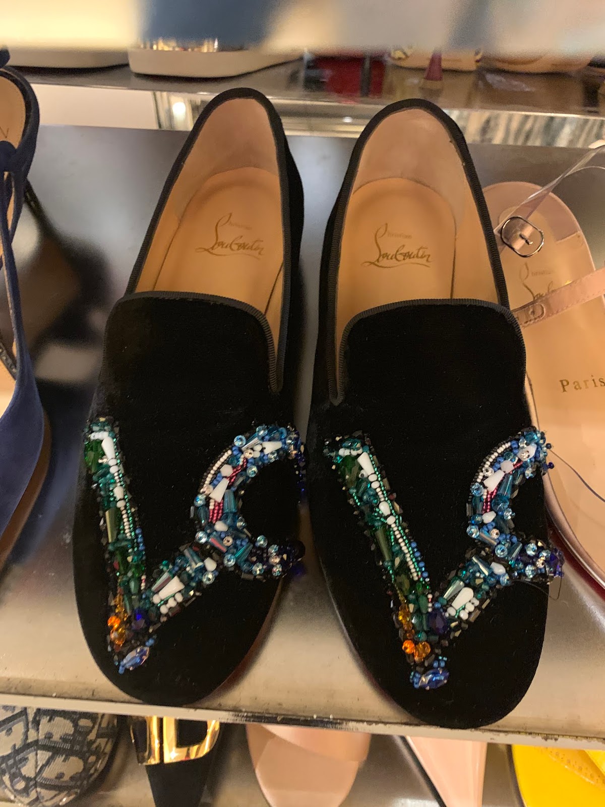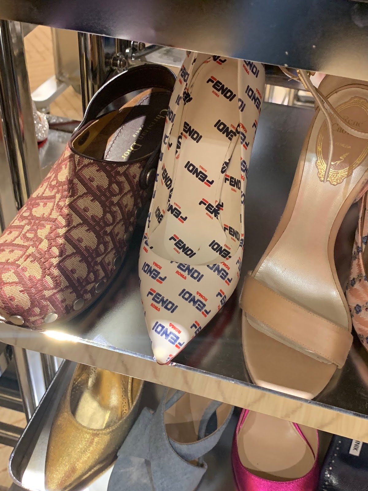 The Hudson Yards store still has lots of Dior shoes. They are currently reduced 40% off but we couldn’t confirm that they would be an additional price cut. At Paramus, there is a large assortment of Louboutin shoes that are getting a second cut. Spiked suede shoes are $414 from $633, Silver Predu style heels are also $441 from $845 and denim spiked Follies are $525 from $1195. You can see pictures over this way.