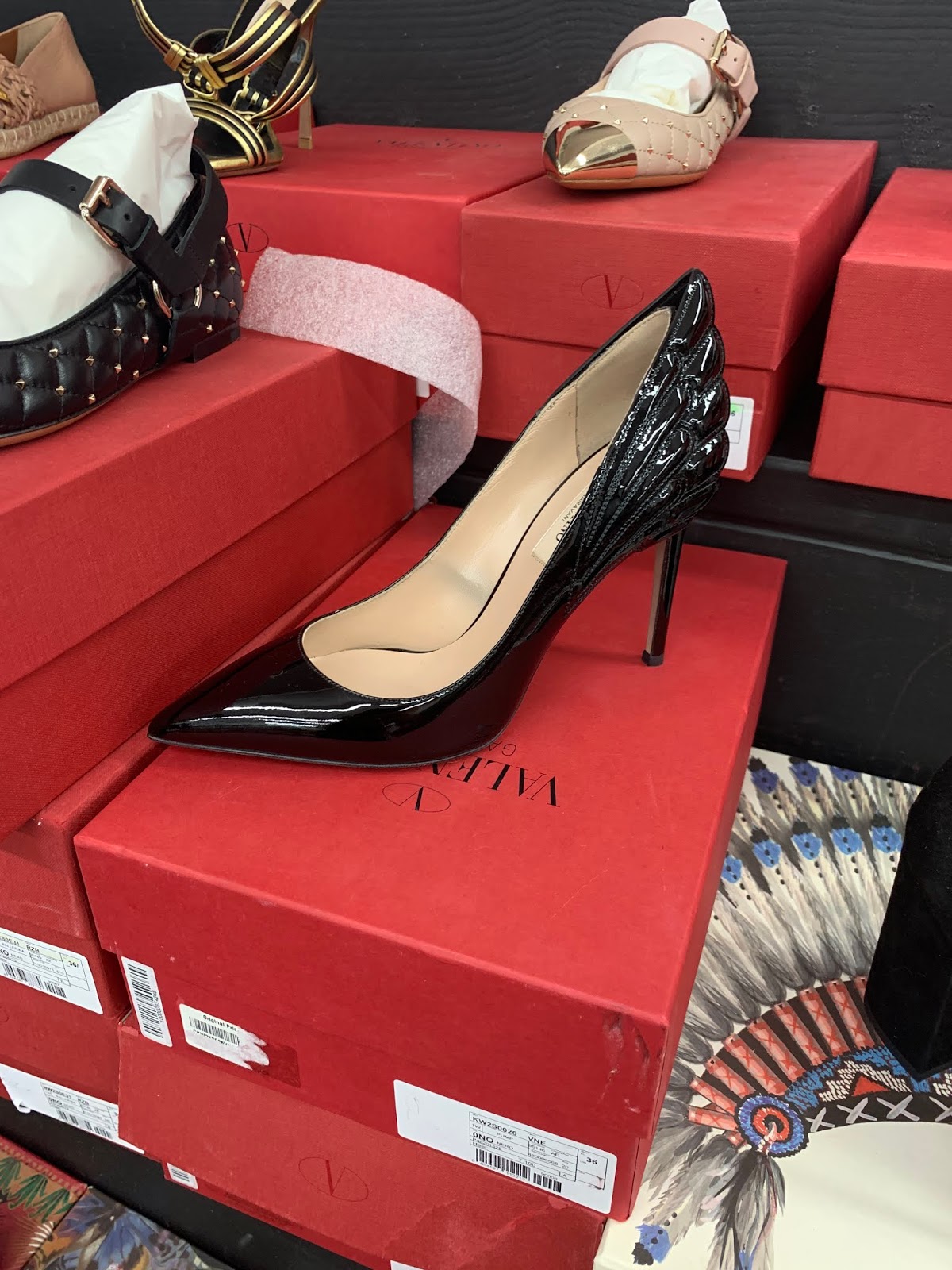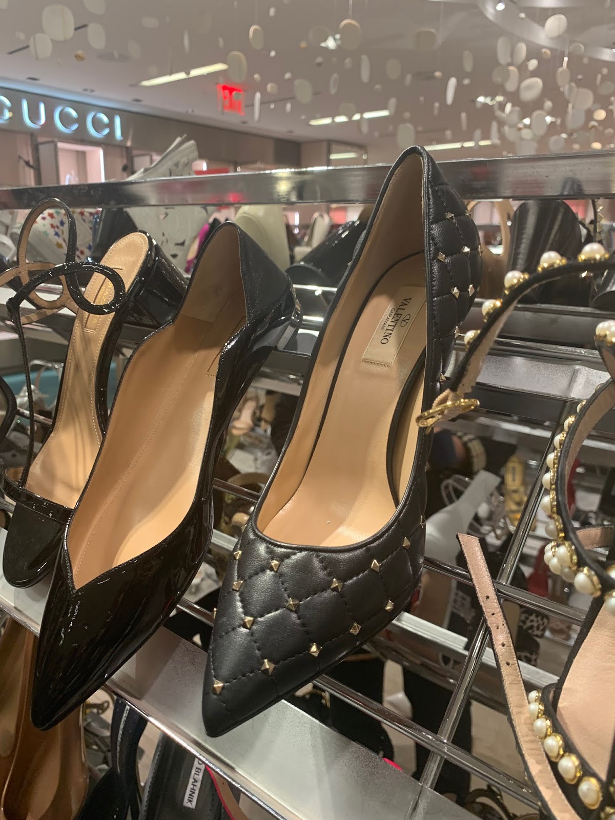 It just keeps getting better. In the back, you will find shoes assorted by size. We immediately fell in love with the most classic style Rockstud pointed toe pumps. They are available in an assortment of colors and there are plenty of size options. The final price is just $255 from $845. It almost feels like one pair is not enough. Basic black patent pumps with a 4″ heel are $330 from $1095 and sneakers are $210 from nearly $700. (That’s less than a pair of Yeezys.) Click over to the jump to see lots of pictures.