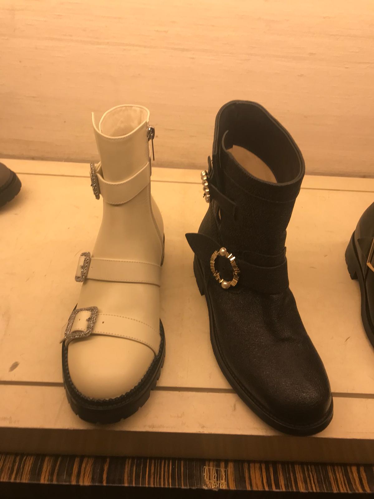 Moving up to shoes the racks are out and so are the crowds. We spotted these Manolo Hangisi flats in a few different styles. They are now $716 from $955. We actually snagged a pair of these Off-White rain boots that say “For Riding.” They were hard to resist at $315 from $450. Shoppers seemed very excited about these Rockstud slouchy leather boots that are now $1256 from $1800 but don’t they seem a bit, Trixy? The minimalism of these Paul Andrew boots seems to resonate a lot better.
