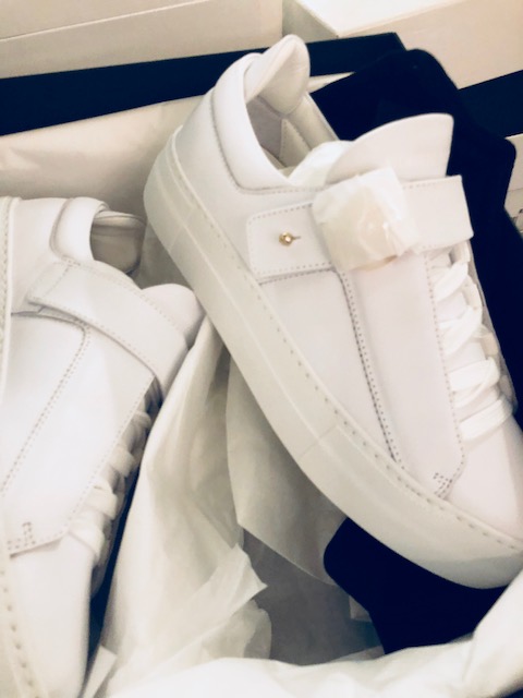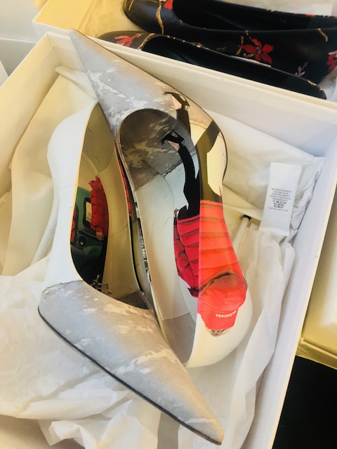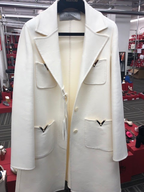 Our next stop was express to shoes. The markdown ranges from 25% to 40% off. We were most surprised to find a full range of beautiful Manolo Blahnik Hangisi shoes on the 40% off markdown table. Here are the tweed pumps we saw reduced to $730 from $1045 The online selection is reduced even more. This satin Hangis d’Orsay is $386 from nearly $1000. Other standouts were Off-White riding boots for $1100 from $1500, Saint Laurent pointy toe pumps, and Jimmy Choo sneakers for $486 from $700. Jump over to see pictures of what else we found on the shoe floor.