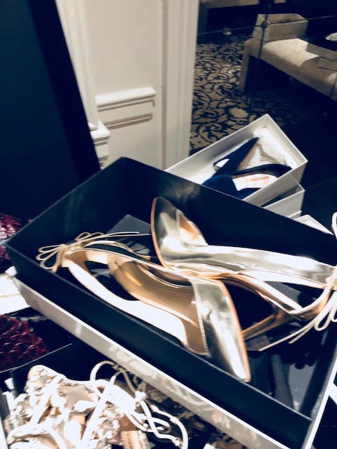 Our next stop was express to shoes. The markdown ranges from 25% to 40% off. We were most surprised to find a full range of beautiful Manolo Blahnik Hangisi shoes on the 40% off markdown table. Here are the tweed pumps we saw reduced to $730 from $1045 The online selection is reduced even more. This satin Hangis d’Orsay is $386 from nearly $1000. Other standouts were Off-White riding boots for $1100 from $1500, Saint Laurent pointy toe pumps, and Jimmy Choo sneakers for $486 from $700. Jump over to see pictures of what else we found on the shoe floor.