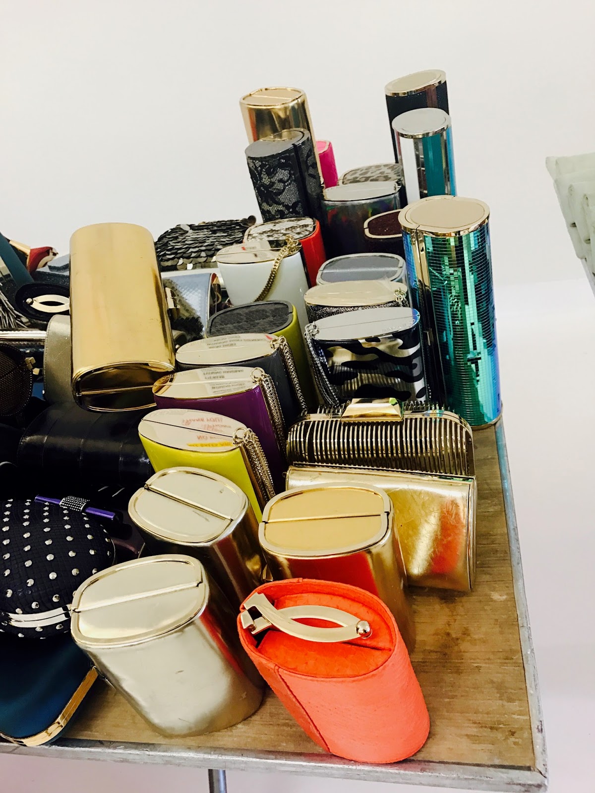 Bags are divided by size among several tables. Evening bags are $350, small bags are $250, medium sizes are $350 and large bags are $450. Exotic bags are an extra $200. In addition to bags, there were tables of wallets, leather accessories, glasses and scarves. Prices start at $100 for wallets and small leather goods, scarves are $75 and belts are $50.