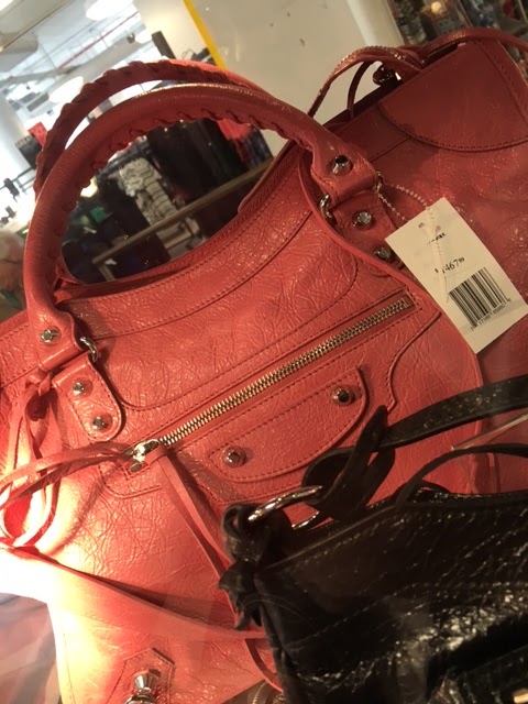 If you’re looking for more upscale designer brands, we suggest you head towards the display cases that contains designer bags and accessories or head downstairs to the shoe department. Among the fancier bags we found a small selection from Alexander McQueen. A mini Heroine tote is $1235 from about $2000 and a classic skull scarf is $235 from about $300. Among the Balenciaga section there is a Mini City for $611 from $765 (We believe that the retail price is quite a bit higher.) A larger size Mini City is $1457. Click here to see pictures.