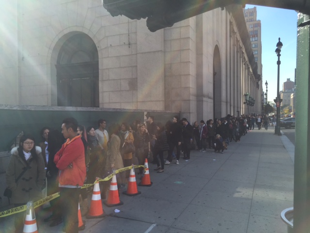 At one point the queue spanned the equivalent of six blocks– 33rd Street West to 9th Avenue, across the span of the post office and back around there-quarters of the way to 8th Avenue. Samuel had 12 of his staff waiting in line throughout the day and was on-site keeping track of the situation. He estimated that only 50 people were being admitted at one time and it took about an hour for each group to be let in.