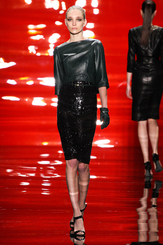 With the red backdrop and black graphite runway, designer Reem Acra was setting the mood for a fierce show. The collection was inspired by feminine power and she did a fabulous job creating fearless female looks for evening. The show started out with leather outfits that accentuated all the beautiful parts of a woman’s body and then came a traffic of chic black dresses, followed by what she does best – striking evening gowns.