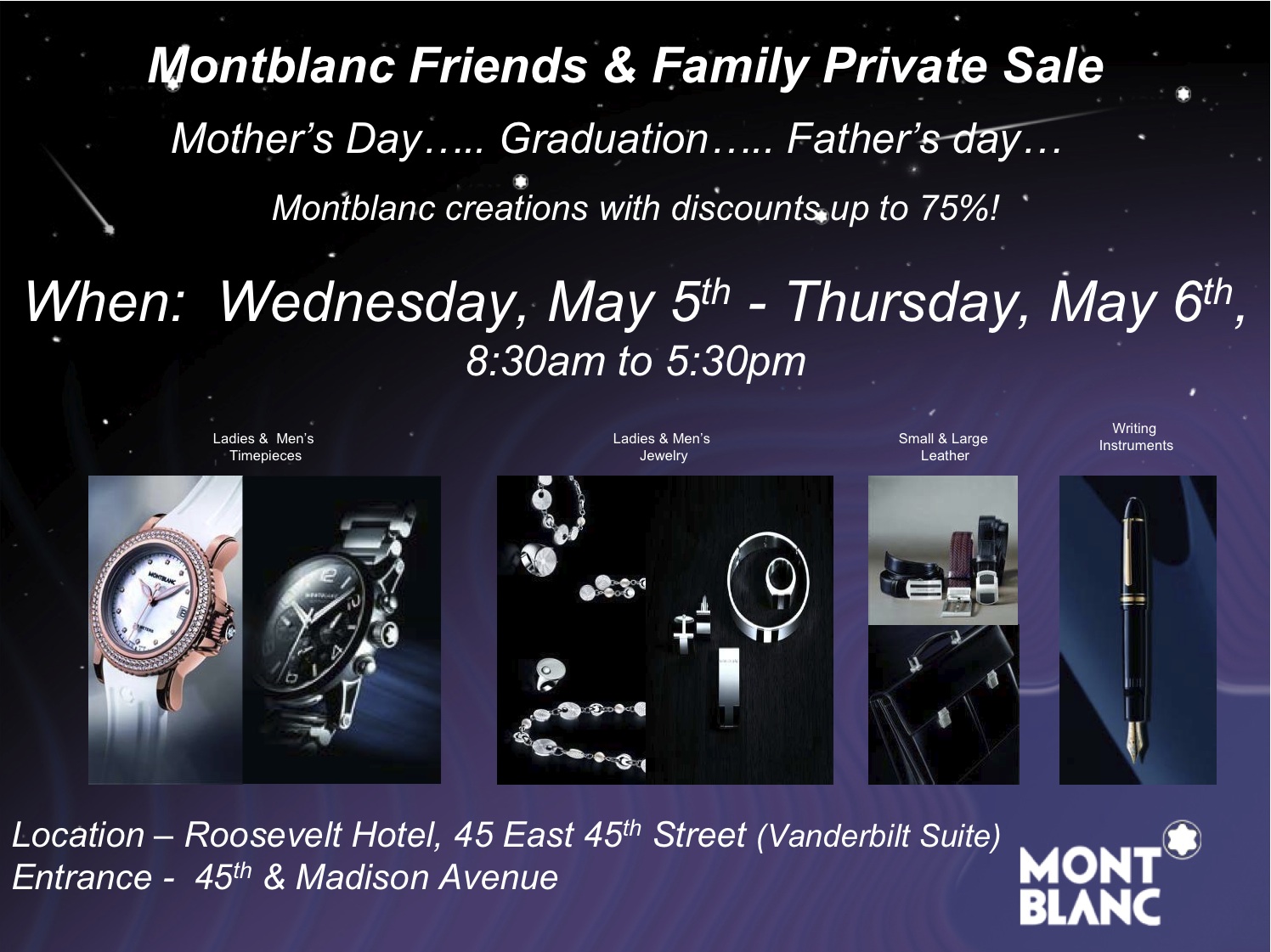 It couldn’t be better a better time to hit a Montblanc sample sale/ friends and family / what-ever-you-want-to-call-it. The sale is Wednesday. May 5th and Thursday, May 6th. Watches, jewelry, leather goods and writing instruments will all be included. Discounts will run up to 75% off retail.