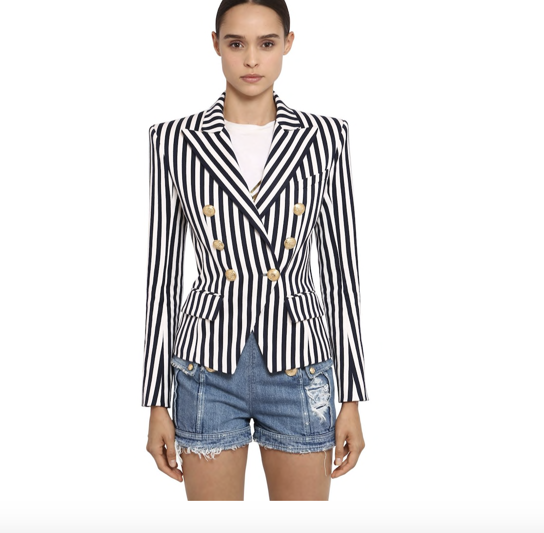 Some other good finds include this Fendi red logo belt that’s $275 from $550. Here it is in black for the same price. Valentino Rockstud sandals are $450 from $750 and we haven’t seen these around the racks for a while. This Prada flame skirt is from last season but still works great for Summer and is a good value at 60% off. This Balmain stripped blazer is $940 from $1885 or 50% off and a Balmain tee is $172 from $342.