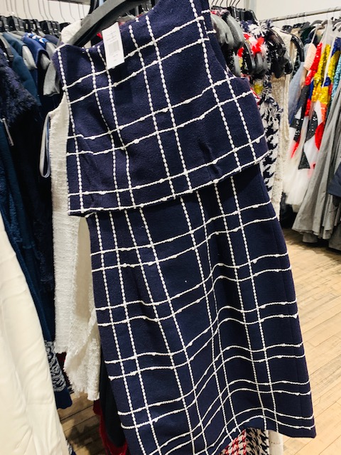 Beyond the children’s clothing, there is a large selection of evening gowns and day dresses. We recognized many of the dresses from the last sample sale but there were some additions from the most recent pre-fall collection. There are dresses, pants, and skirts in an eye-catching giant houndstooth tweed.