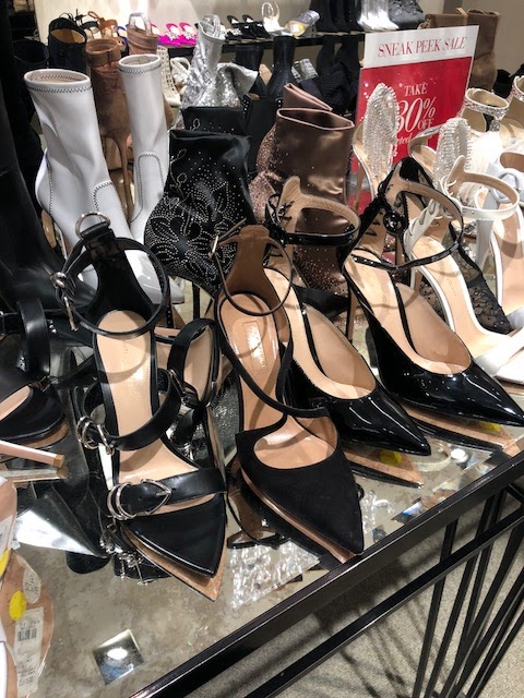 Our next stop was express to shoes. The markdown ranges from 25% to 40% off. We were most surprised to find a full range of beautiful Manolo Blahnik Hangisi shoes on the 40% off markdown table. Here are the tweed pumps we saw reduced to $730 from $1045 The online selection is reduced even more. This satin Hangis d’Orsay is $386 from nearly $1000. Other standouts were Off-White riding boots for $1100 from $1500, Saint Laurent pointy toe pumps, and Jimmy Choo sneakers for $486 from $700. Jump over to see pictures of what else we found on the shoe floor.