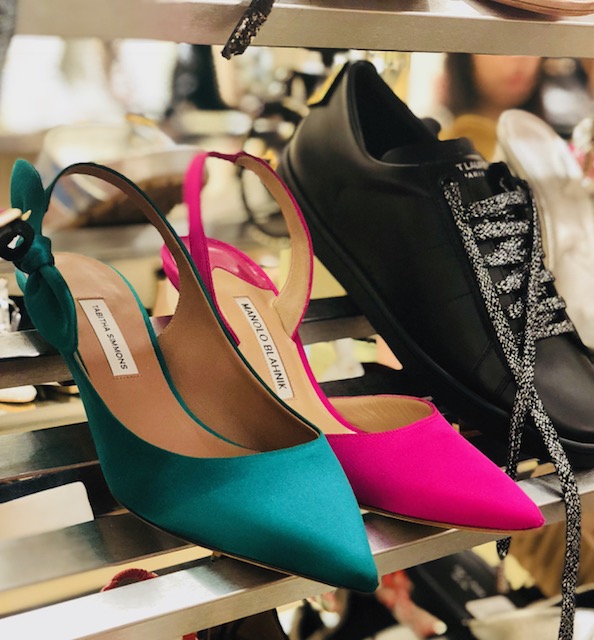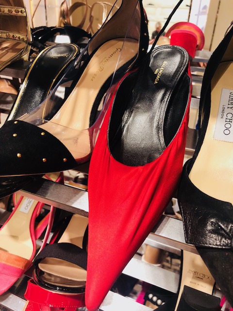 Upstairs in the shoe department, a lot of the best style shoes are selling out. We saw these Fendi pearl flats in a few sizes reduced to $472 from $900. Here they are in a heel or a sock-boot. These Gucci espadrilles are under $280 from $630. These Jimmy Choo cork wedge sandals are a steal for $200 from $450 and Manolo Hangisi Berk-style sandals are $500 from $1100. You can see pictures from inside the Saks shoe sale over here but we think that the online selection and prices might even be better than what we found at the store.