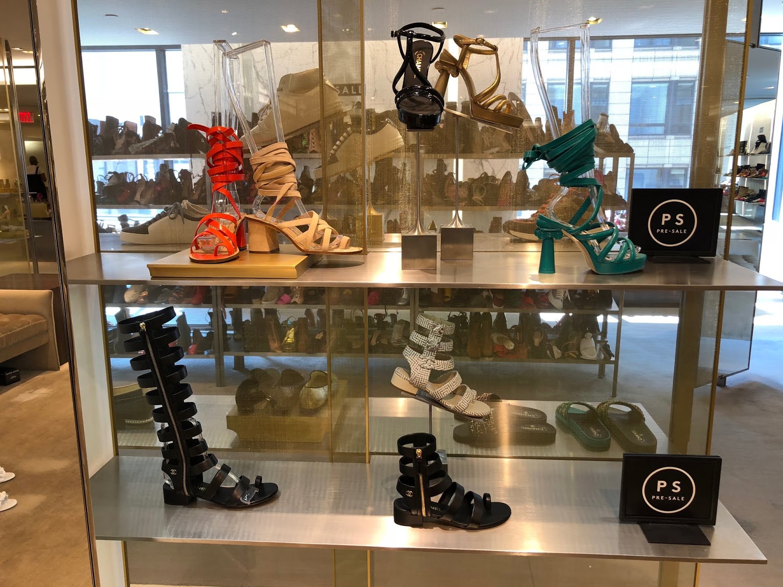 Upstairs in the shoe department, a lot of the best style shoes are selling out. We saw these Fendi pearl flats in a few sizes reduced to $472 from $900. Here they are in a heel or a sock-boot. These Gucci espadrilles are under $280 from $630. These Jimmy Choo cork wedge sandals are a steal for $200 from $450 and Manolo Hangisi Berk-style sandals are $500 from $1100. You can see pictures from inside the Saks shoe sale over here but we think that the online selection and prices might even be better than what we found at the store.