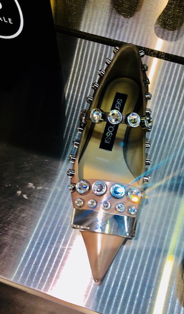 Personally, we find the platform peep-toe sparkle shoe a little dated. We were more attracted to a basic suede in navy or purple ($250) pump, a flat with oversized gems ($325), a peep-toe with small jeweled details ($325) or a basic pump with studded jewels. You can click this way to see pictures and of our favorite shoe styles from the Jimmy Choo sample sale.