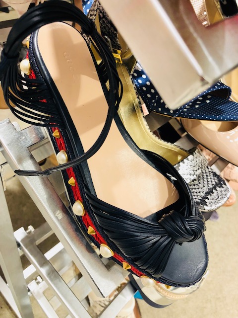 Upstairs, in the shoe department, there are still plenty of racks of sale shoes. Most shoe styles are 60% off and there aren’t any additional promotions. On the bright side, the Vetements x Manolo collaboration has hit the ‘racks.’ We found Vetements x Manolo satin ankle boots that are now $800 from nearly $2000 and stain pumps with an ankle strap are $710 from $1775. Other interesting finds are basic Chanel pumps that were priced at $300 from $750, Roger Vivier espadrilles are $290 from $725, Gucci flatforms $575 from $1150, Prada embellished mules are $396 from $990 and Miu Miu fur slides are $380 from $950. Pictures and prices are right this way.
