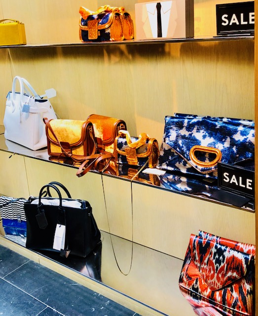 Starting off, on the main floor, we found a few tables of bags. Bright pink and blue Balenciaga City bags and totes are reduced 50%. The most attractive sale assortment is the Valentino bags, which can be found at the center of the main store. A gorgeous, light blue, Rockstud Spike bag that’s now $1600 from $3195. We also found a black Demilune bag that’s $1300 from $1200. A Dries top handle bag is about $500 from $950 and mini Givenchy Horizon bags in blue and purple are about $1000 from $2000. (You can see pictures of more bags over this way.)