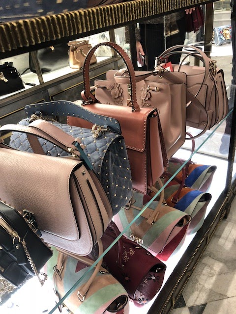 Starting off, on the main floor, we found a few tables of bags. Bright pink and blue Balenciaga City bags and totes are reduced 50%. The most attractive sale assortment is the Valentino bags, which can be found at the center of the main store.  A gorgeous, light blue, Rockstud Spike bag that’s now $1600 from $3195. We also found a black Demilune bag that’s $1300 from $1200. A Dries top handle bag is about $500 from $950 and mini Givenchy Horizon bags in blue and purple are about $1000 from $2000. (You can see pictures of more bags over this way.)