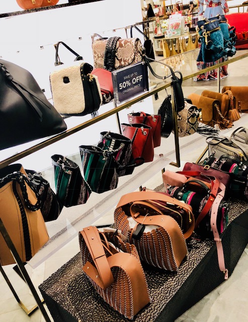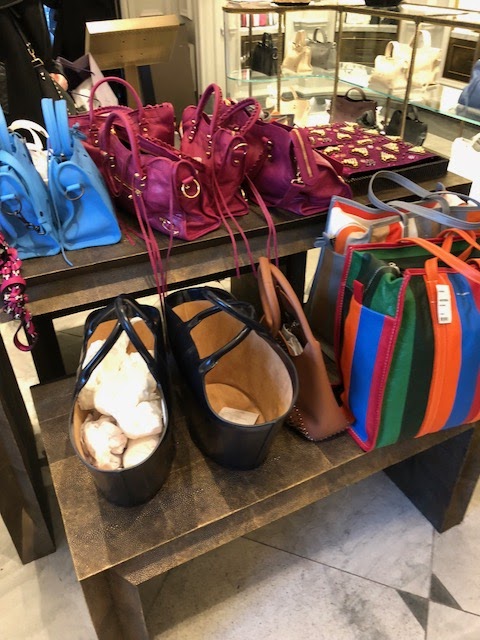 Starting off, on the main floor, we found a few tables of bags. Bright pink and blue Balenciaga City bags and totes are reduced 50%. The most attractive sale assortment is the Valentino bags, which can be found at the center of the main store. A gorgeous, light blue, Rockstud Spike bag that’s now $1600 from $3195. We also found a black Demilune bag that’s $1300 from $1200. A Dries top handle bag is about $500 from $950 and mini Givenchy Horizon bags in blue and purple are about $1000 from $2000. (You can see pictures of more bags over this way.)