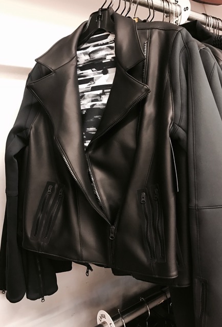 In the back there is a quiet area with a few racks of outerwear. Everything there is a straight 50% off. Among the selection is an bomber jacket from Upside that’s $125 from $256. It’s still full price here. A long cardigan from Monrow is $185 from $370 and a Prabal Gurung moto jacket in a scuba fabric is $150 from $295.
