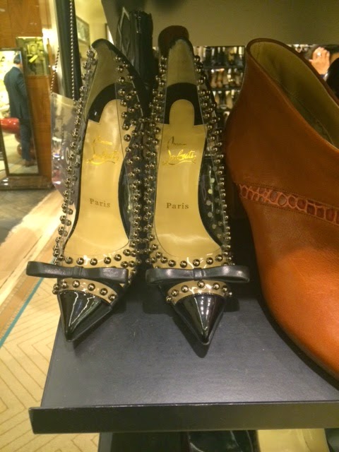 The discount on shoes is still just 50% off, where the discount at Barneys is 60%. The difference is that Bergdorf Goodman has a lot more classic wearable shoes. As a matter of fact a bulk of the inventory is Christian Louboutin and Manolo Blahnik. Among the Louboutins is a mid-high pump with PVC around the parameter for $350 from $695 and the flat version is $319 from $595. (These are almost sample sale prices.) Cabochon embellished extra high Loubs are $700 from about $1400 and a studded version with patent detailing and bows are $650 from $1295. Broadening out from the red soles, we found our favorite Givenchy shark bit riding boots for $729 from $1450, Valentino Rockstud pony hair booties are $1719 from $2295 and Chanel quilted low moto boots are $709 from $1425. Check out pics of everything mentioned here.
