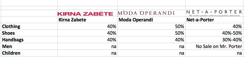Take note, that Moda Operandi seems like the overall winner as it still has a really great selection of designer merchandise and most everything is 50% off. Below is a comparison chart of Kirna Zabete, M’Oda Operandi and Net-a-Porter.