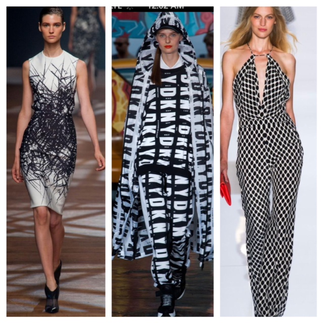 The fastest way to chic in 2014 is black and white. Almost every designer devoted a segment of their collection to a yin-yang combo. Yigal Azrouel used black and white prints to inspire minimalism, here DKNY printed her iconic logo in black and white and if you have legs as long as a giraffe than this DVF black and white jumpsuit is something you just can’t live without.