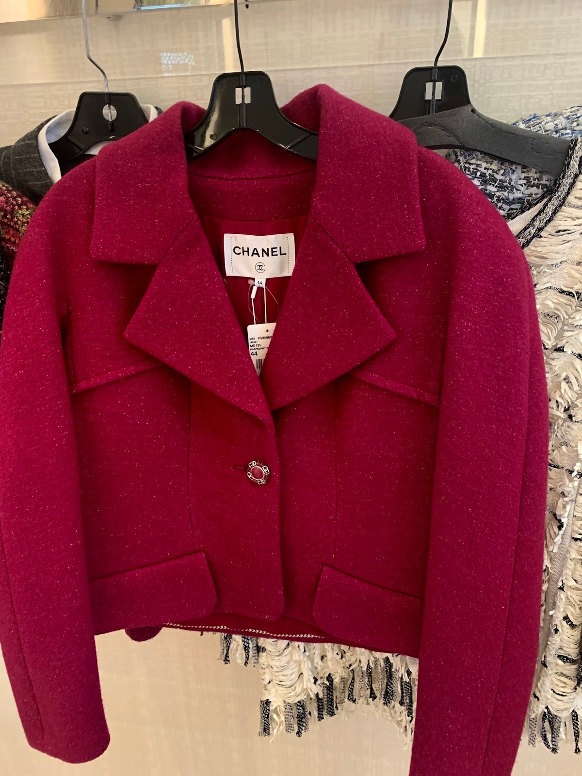 From what we’ve seen, Bergdorfs has the most selection and size assortment and you can see it pretty freely. Bloomingdales has a few rolling racks and six shoe styles. The inventory at Saks is organized, accessible but small. Our favorite pieces are a four-button hot-pink cardigan that comes to $1224 from $2040 and a deep pink wool one-button jacket that’s $2550 from $4250. Click here to see pictures of clothing, jewelry, and shoes that will be part of the sale.