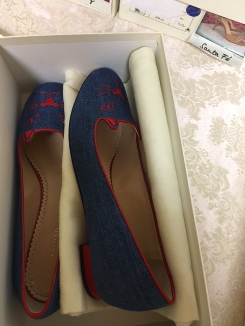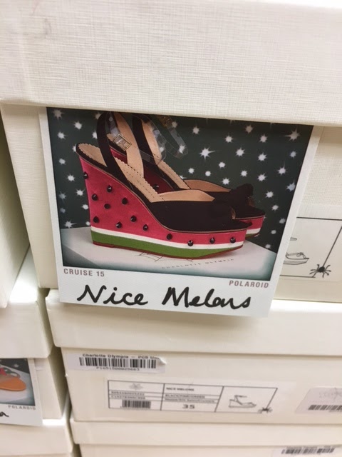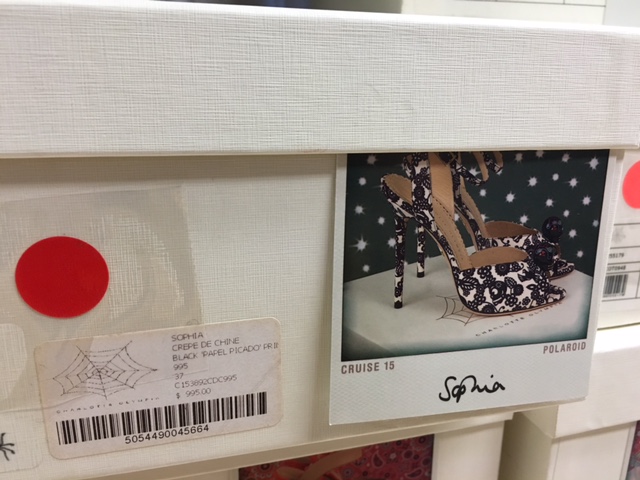 Many shoe styles, including flats, are $250. Most of the selection are summer styles but there is a scattering of in-season and holiday inspired theme shoes. Sizes run from 34 to 42 but the best selection goes to those who wear a size 36. You can click here to see a range of pictures of shoes and bags that we found at the sale.