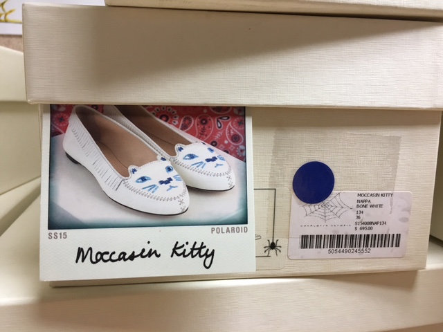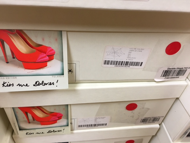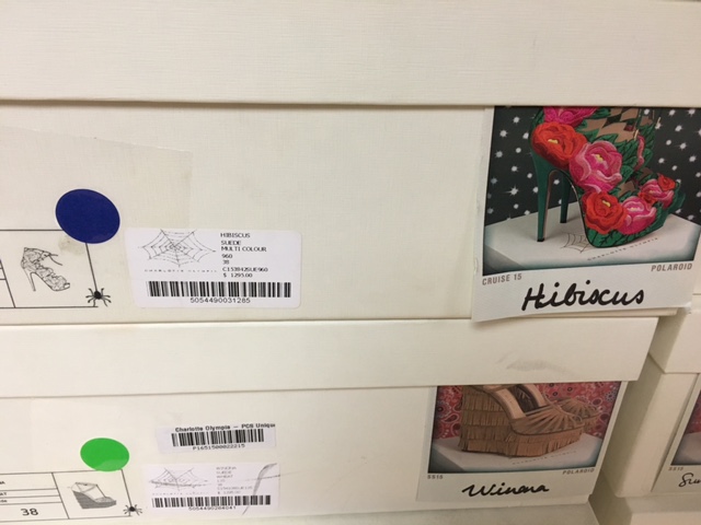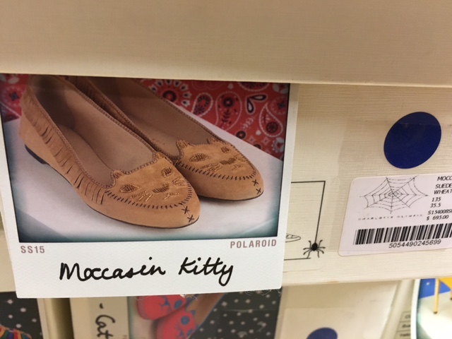 The Charlotte Olympia sample sale started early this morning. The sale includes a variety of the designer’s quirky heels and a scattering of kitty flats. Prices are indicated by sticker and start at $150 and go up to $400 for an elaborate bag.