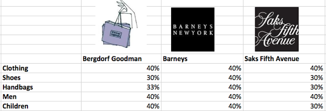 Some boutiques are offering even lower discounts than the department stores. For instance, Lanvin and Prada are both offering customers a 50% savings. Below is a comparison chart of Barneys, Bergdorf Goodman and Saks Fifth Avenue. Take note, for a limited time Barneys is offering a extra 10% off, which brings the total savings to about 45% off.