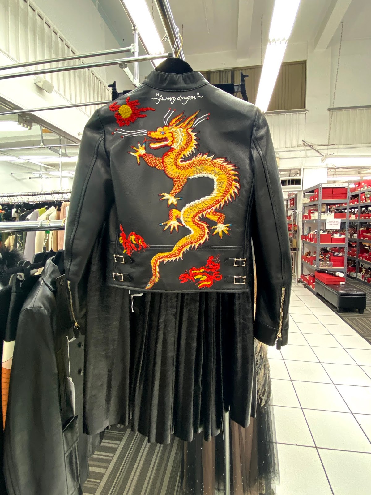 Who needs to rent high-end fashion when you can own it for even less? Check out this embroidered buttery soft leather jacket that is a ” lifetime” item and it’s $1260 from nearly $6300. A mid-length fur jacket is $2000 from over $10,000. Some more casual items include a track jacket that’s $380 from $1990 and coordinating silk track pants are about the same price. The ensemble was a key component of the 2018 resort collection. You can click here to see pictures of the amazing fashion we spotted.