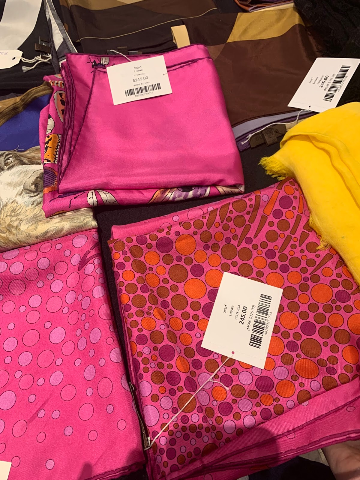 Unfortunately, all the Louis Vuitton monogram merchandise is completely sold out. I saw a handful of Epi leather bags. A Sac A Dos is reduced to $410, a Dhanura PM is $240, and a Masty GM is $260. Beyond Vuitton, I saw a Gucci heart print canvas tote that’s $300, a Bottega Veneta Cabat tote is $1500 and a very proper Cartier shoulder bag is about $370 from an MSRP of $1350. We also spotted a few Loewe scarves that are about $120. They are normally priced at $375 when purchased new. A PM Hermes Garden Party in good condition is $610 and a Fourre Tout PM is $250. You can click here to see pictures.