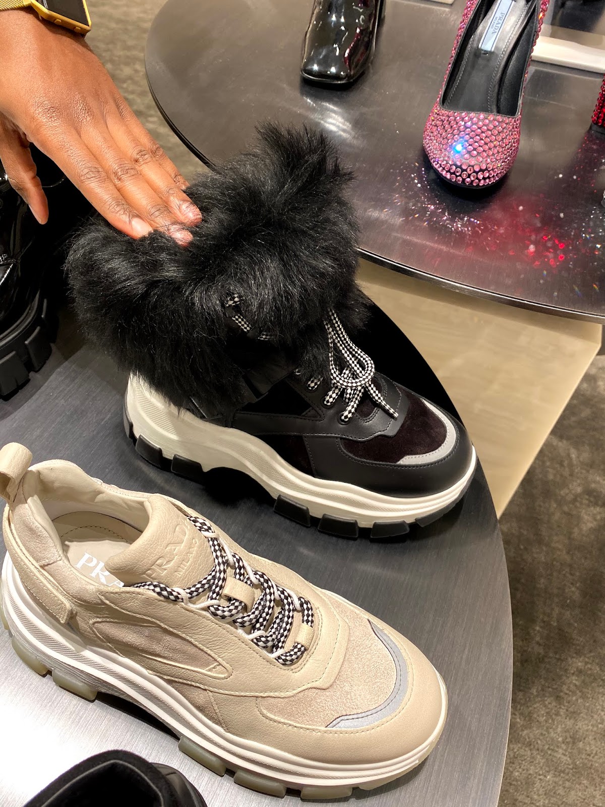 Some designer merchandise is already discounted online. Discounts range from 25% to 33% off. Some of the standouts include this Chloe shirtdress that’s reduced to $1762 from $2350 and a Versace print belted dress for $1500 from $2000. Gianvitto Rossi shearling boots are $1120 from $1500 and Balenciaga pointed toe boots are $1100 from $1475.