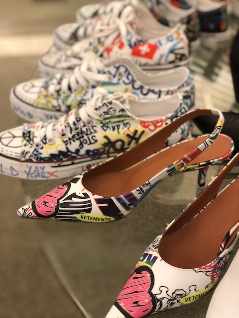 Our next stop was express to shoes. The markdown ranges from 25% to 40% off. We were most surprised to find a full range of beautiful Manolo Blahnik Hangisi shoes on the 40% off markdown table. Here are the tweed pumps we saw reduced to $730 from $1045 The online selection is reduced even more. This satin Hangis d’Orsay is $386 from nearly $1000. Other standouts were Off-White riding boots for $1100 from $1500, Saint Laurent pointy toe pumps, and Jimmy Choo sneakers for $486 from $700. Jump over to see pictures of what else we found on the shoe floor.