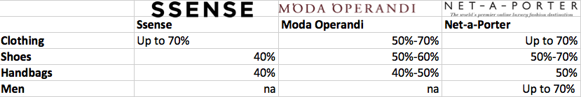 Take note, that Moda Operandi seems like the overall winner as it still has a really great selection of designer merchandise and most everything is 50% off. Below is a comparison chart of Ssense, M’oda Operandi and Net-a-Porter.