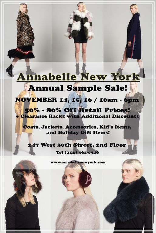 Just in time for the cold snap, Annabelle is hosting what’s sure to be an amazing sample sale of high-quality fur coats, vests, jackets, and accessories for women and children. We are told that prices will be well under wholesale. Expect to find discounts ranging from 50% to 80% off retail.